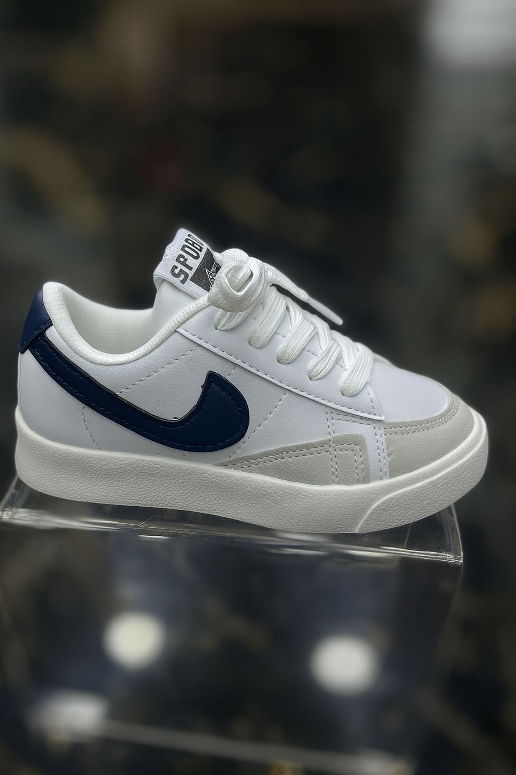 حذاء رياضي كاجوال بتصميم بسيط وأنيق يجمع بين اللون الأبيض والكحلي.