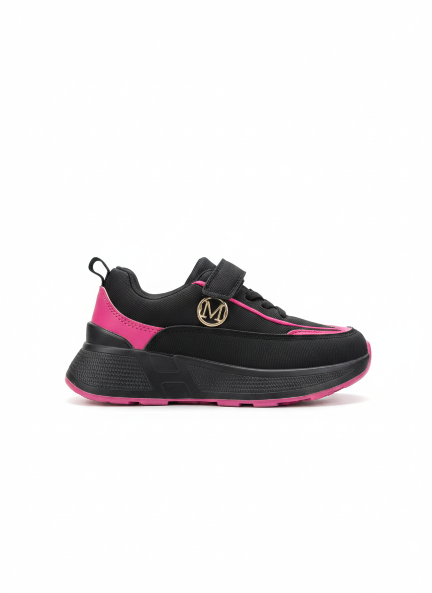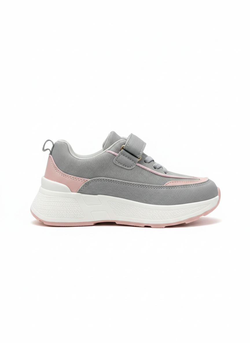 الخيار الأمثل للراحة اليومية بتصميم رقيق. حذاء رياضي يجمع بين الرمادي الهادئ والوردي الناعم، مع لاصق “فيلكرو” لسهولة الارتداء والخلع.