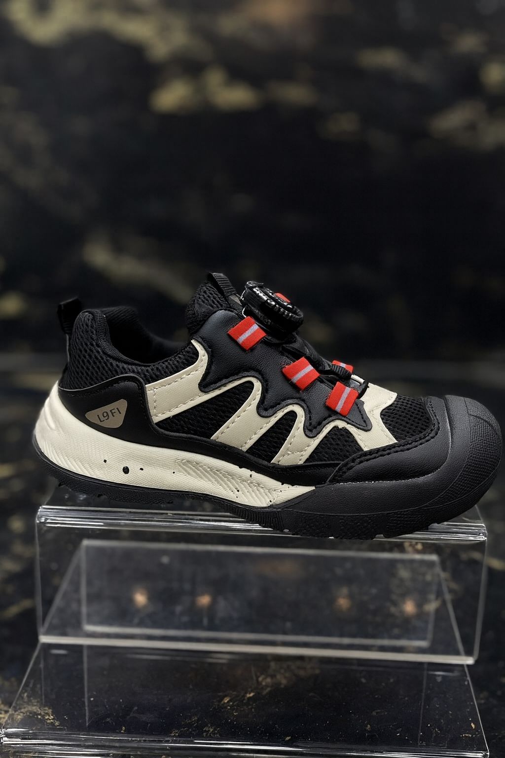 حذاء رياضي عصري بتصميم شبكي مريح مع تفاصيل باللون الأحمر لإطلالة شبابية جريئة.